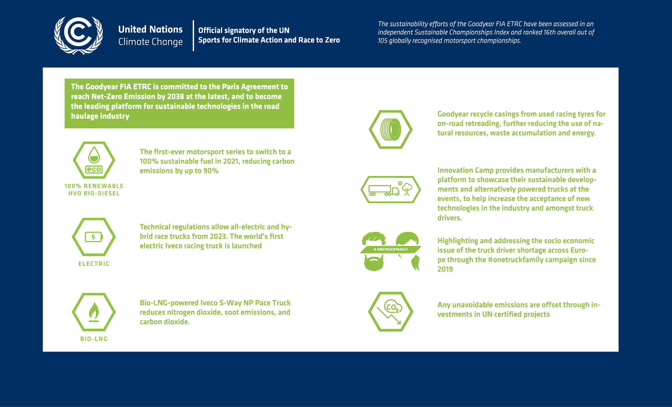 In 2020 ETRA included sustainability as one of the three strategic pillars of the Goodyear FIA ETRC and our sustainability roadmap sets out concrete measures across our operation to achieving our goal of carbon neutrality by 2038 at the lastest.